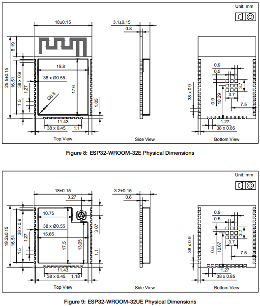 모듈 도명 (ESP32-WROOM-32E와 32UE는 pin to pin 호환 가능)
