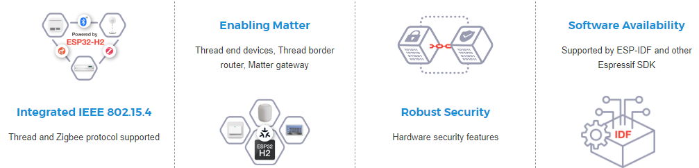 ESP32-H2-MINI-1은 강력한 일반용 블루투스 Low Energy 및 IEEE 802.15.4 콤보 모듈로 ESP32-H2 칩을 기반으로 합니다. 이 모듈은 전력 소모에 높은 요구를 가지는 IoT 응용 프로그램을 구축하기에 이상적입니다. 예를 들어, 이 모듈을 사용하여 Matter 기반 스마트 홈 장치를 구축할 수 있어 서로 다른 생태계 간의 상호 운용성을 제공하거나, 다른 Espressif Wi-Fi 제품과 함께 사용하여 Thread boarder 라우터를 만들 수 있습니다. 이 모듈은 매우 작은 크기로, ESP32-C3-MINI, ESP32-C6-MINI 모듈과 핀 간 호환성이 있습니다.