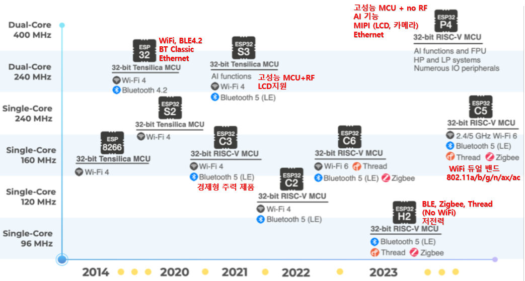 | 무선통신 | WiFi | WiFi+BLE | WiFi+BLE | WiFi+BLE | WiFi+BLE +Thread+Zigbee |