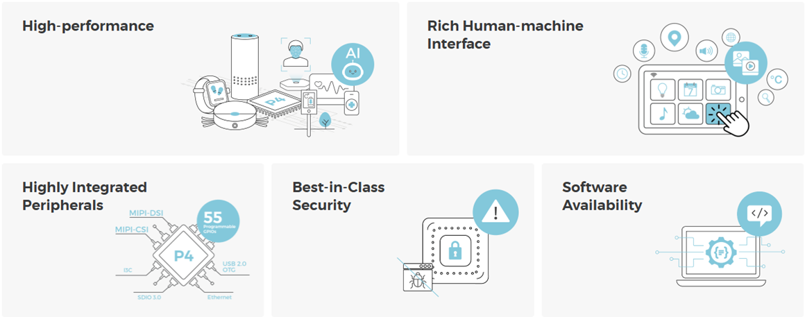 응용 분야 | - 스마트 홈 기기 (스마트 디스플레이, 보안 카메라, 홈 오토메이션 허브) - 산업 자동화 (IoT 센서, 공장 자동화 장비, 스마트 컨트롤러) - 멀티미디어 장치 (디지털 사이니지, 미디어 플레이어, 휴대용 영상 기기) - 의료 기기 (의료 데이터 수집 및 처리 장치) - AI 기반 제품 (얼굴 인식 시스템, 음성 제어 장치, 스마트 감시 카메라) - 영상 처리 응용 (머신 비전 시스템, 실시간 영상 분석 장치, 증강현실(AR) 기기) |