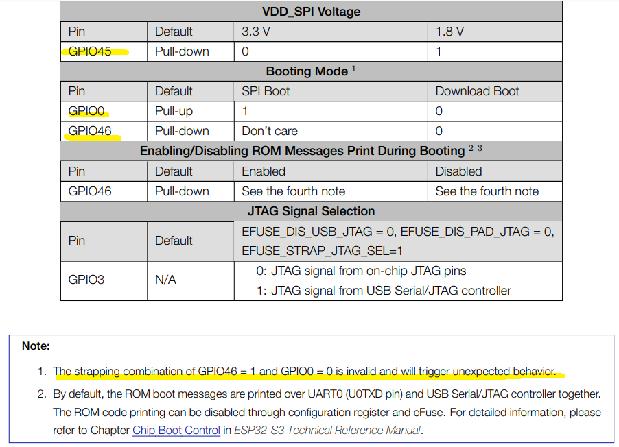GPIO46이 특이 한데, GPIO46=1, GPIO0=0에서 부팅하면 안된다고 합니다.
