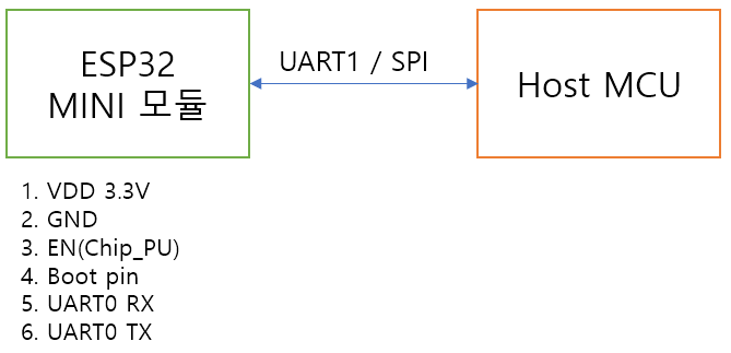 ESP32 모듈 쪽은 6개의 핀을 설계하면, UART1/SPI로 호스트와 통신이 가능합니다.