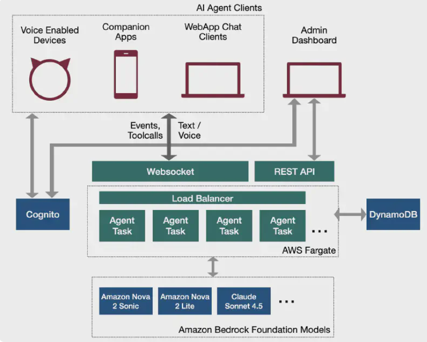 개발자는 AWS Bedrock의 다양한 모델 중 선택할 수 있으며, 성능·비용·행동을 제어할 수 있습니다. 텍스트와 음성 모달리티별로 다른 LLM을 지정할 수 있어, 예를 들어 경량 모델은 음성 대화용, 고성능 모델은 복잡한 텍스트 추론용으로 사용할 수 있습니다.