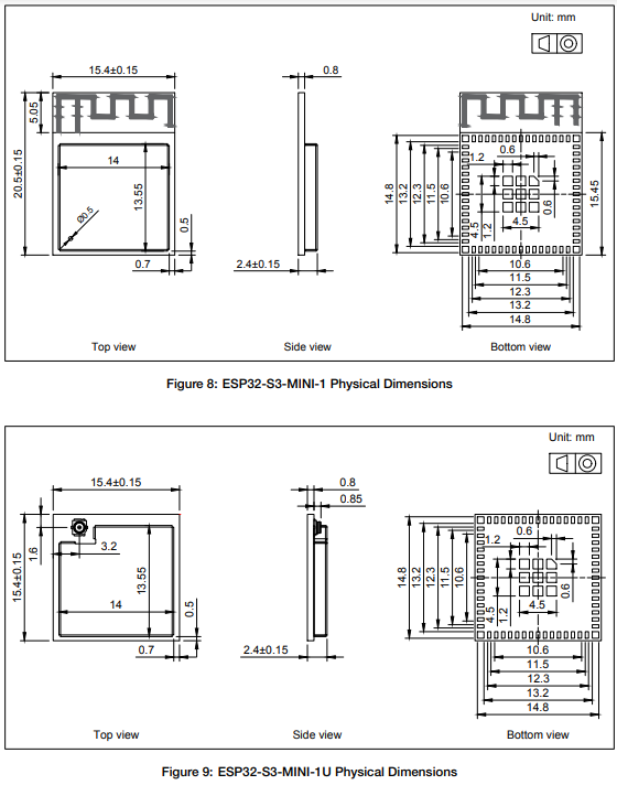 | ESP32-S3-MINI-1U-N4R2 | 4MB QIO | 2MB QIO | -40~85C | 15.4x15.4x2.4mm |
