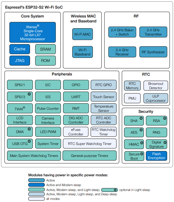 - Security features: eFuse, flash encryption, secure boot, signature verification, integrated AES, SHA and RSA algorithms