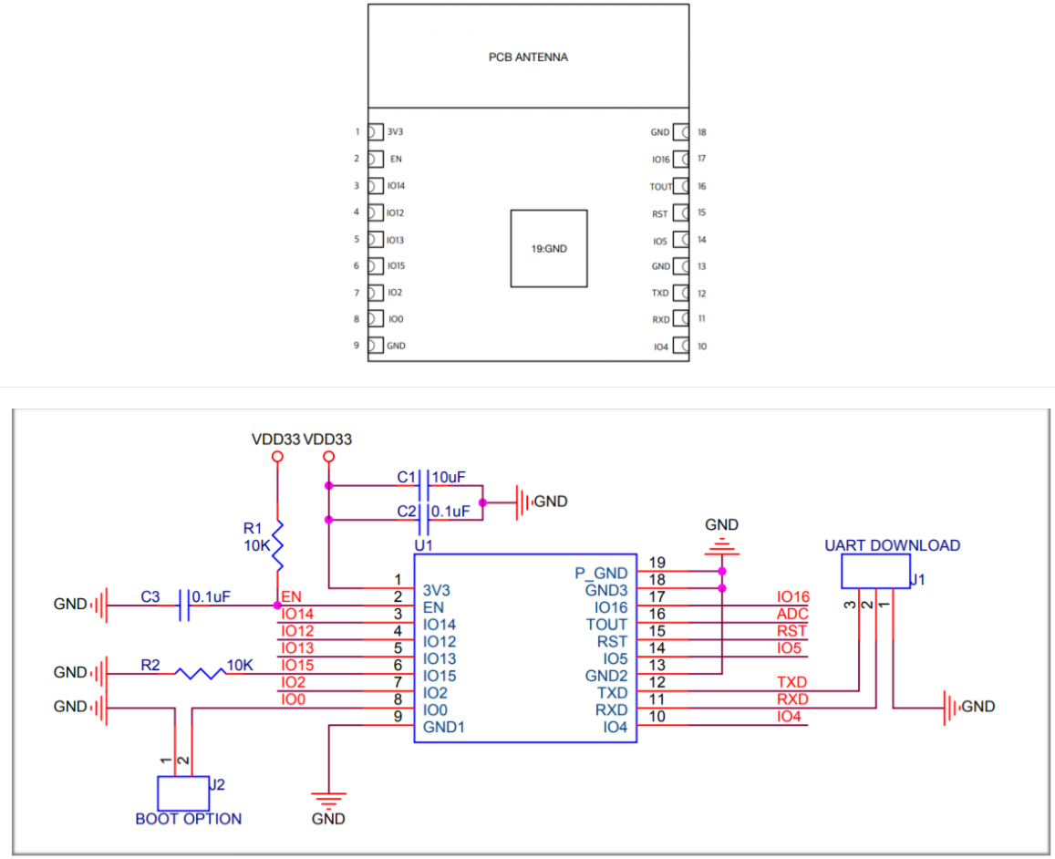ESP-WROOM-02D와 ESP-WROOM-02U는 사이즈, 핀맵, firmware가 동일하여 Pin to pin 호환 됩니다.